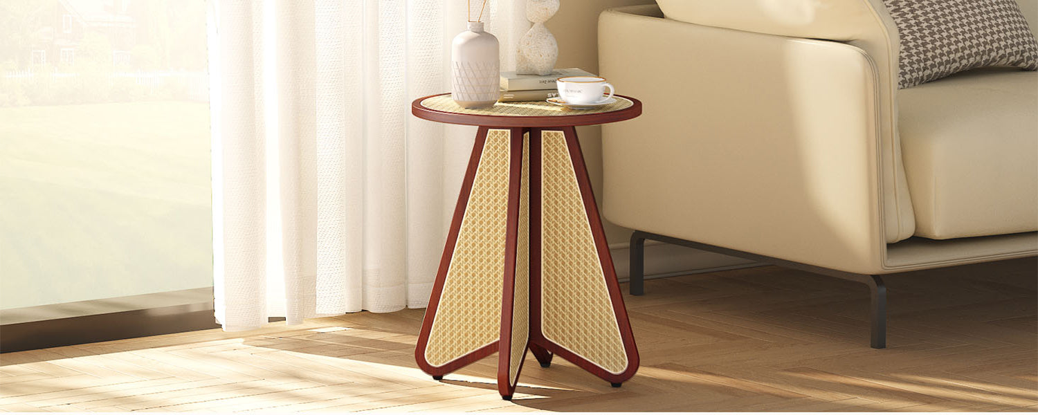 This round rattan side table flaunts a charming medieval aesthetic that effortlessly blends with any interior. It's perfect whether you need a living room table, a bedside table, or a coffee table. It not only meets your various requirements but also adds an elegant touch to your space.